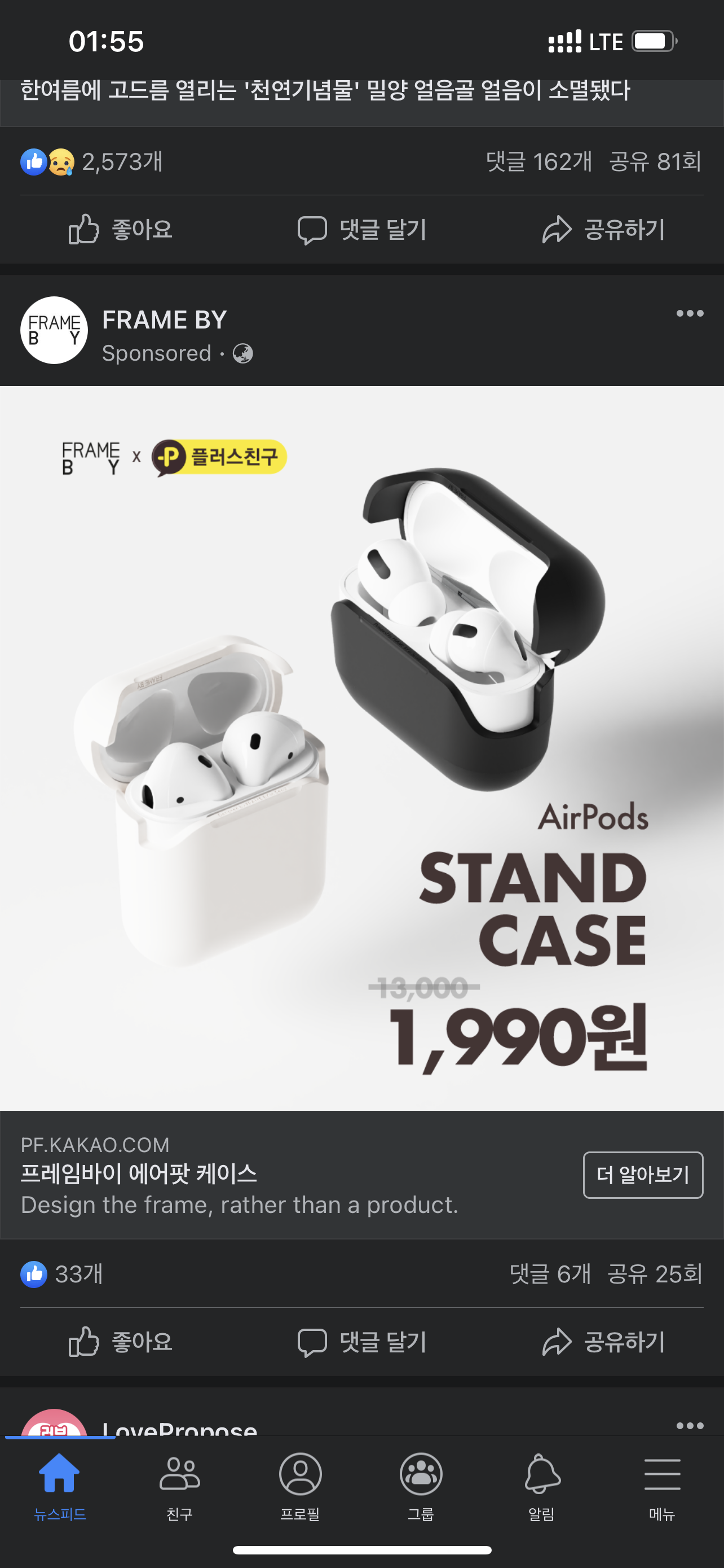 페이스북을 보다가 사진과 같은 광고를 몇일간 지속적으로 보게 되었다. 에어팟 프로에 다이소 투명 케이스를 쓰고 있었는데 이참에 바꿔볼까.. 하는 생각에 구매를 했다. 정가는 13,000원이지만 카톡 플친 추가 후 쿠폰을 발급받아 1,990원 + 배송비 3,000원에 구매할 수 있었다. |